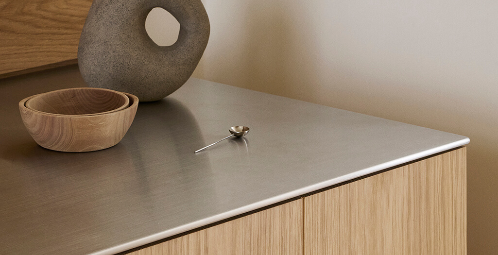 Layer offers a selection of countertops that emphasise the kitchen’s graphic expression and vertical rhythm, from solid wood with vibrant grain patterns to cool stone surfaces and precise metallic tones.