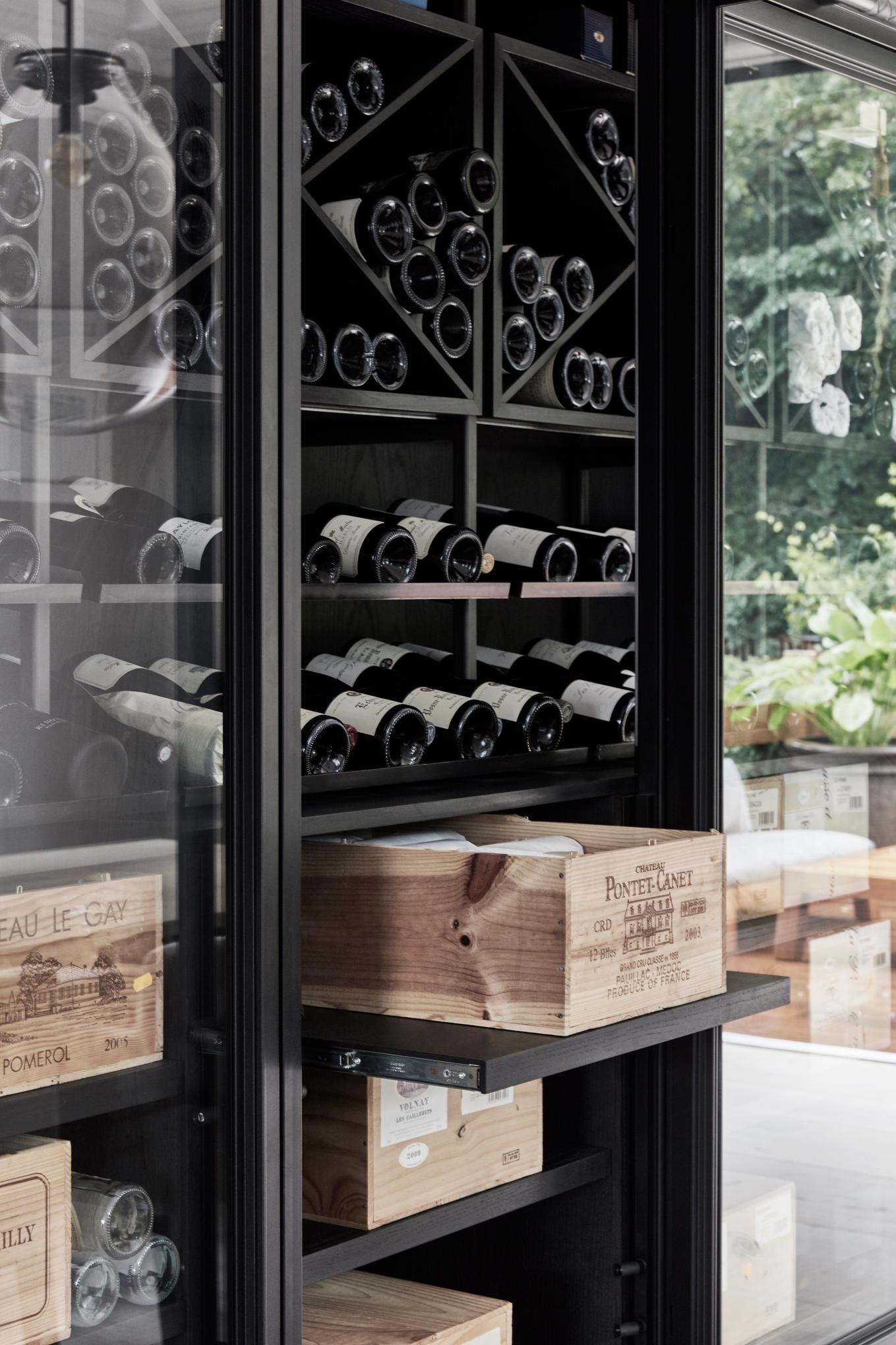 For Villa V, we custom-designed a range of interior features, from hallway furniture to a unique wine cabinet with a central location and last, but not least, a Solid kitchen. Hallway furniture and cabinets are hand-crafted in smoked oak. The wardrobe closets have classic panel doors and are supplemented with a ladder system with braided leather details. The large luxury kitchen is made of Dinesen HeartOak with a White Oil finish that gives the wood a sophisticated light colour. The kitchen island is designed to accommodate the whole family, while the tall cabinets covered in black linoleum conceal kitchen appliances and storage space. From the kitchen there is access to the large dining room, where we designed an integrated refrigerated wine cabinet. Unique glazed doors maintain the correct temperature, while the hand-crafted cabinet interior in solid smoked oak provides a beautiful presentation of the impressive wine collection. An elegant home, down to the last hand-crafted detail, all in all.