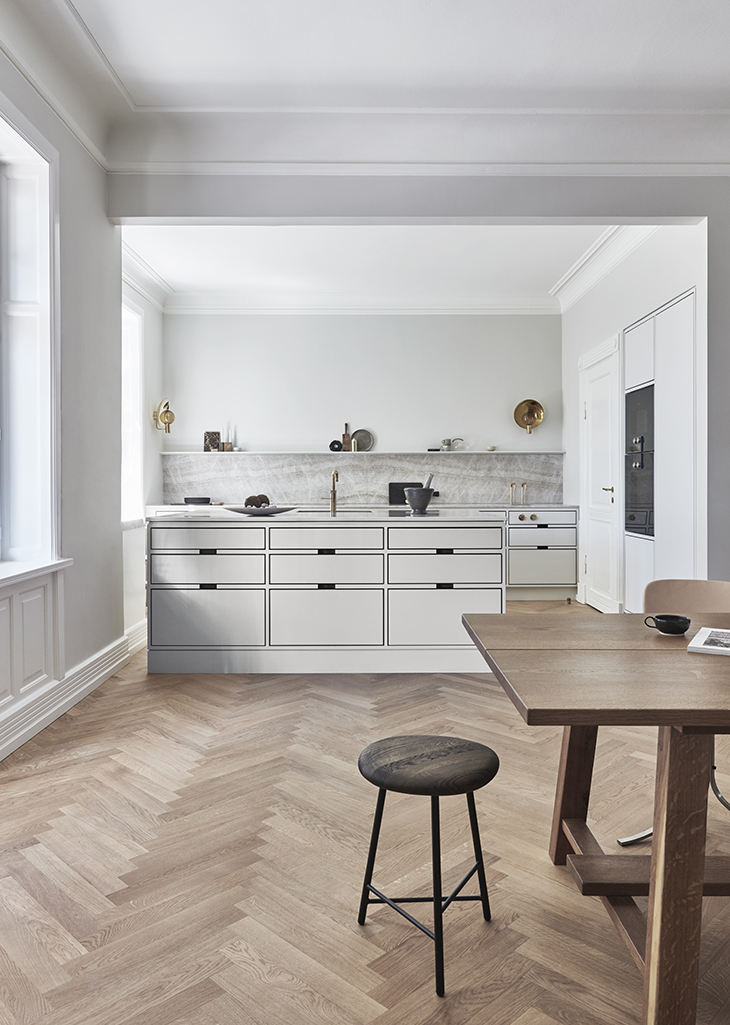 The moment you enter this sophisticated home in Aarhus, you sense the embrace of the calming atmosphere. The beautiful hand-crafted kitchen is made of oak with hand-painted fronts that match the elegant flat’s original expression from 1909. In combination with the white marble, it adds to the stylish expression of the room. From the finger-jointed drawers to the integrated tall cabinets and the pantry with walls and hand-painted fronts in a beautiful shade of rose, the exceptional craftsmanship makes a statement and complements the many grand architectural features. See also the hand-painted hand-crafted bathroom unit and the bespoke shelving unit with a built-in bench.
