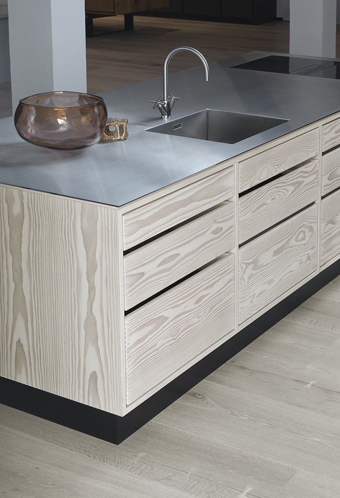 At bruge kontraster inden for køkkendesign er en helt særlig disciplin, som kan være med til at skabe kant. Den store køkkenø i douglasgran tager udgangspunkt i model Lundgaard & Tranberg, der er en født designklassiker med sine synlige tapsamlinger og afbalancerede proportioner. Det elegante snedkerkøkken får et moderne løft med stålbordpladen, der tilføjer personlighed og er velegnet til gastronomiske udfoldelser. Se også arkitekt Lene Tranbergs refleksioner om modellen.