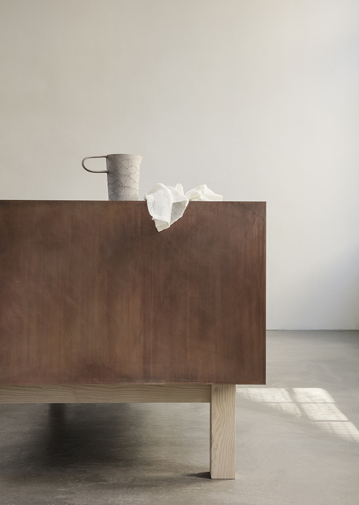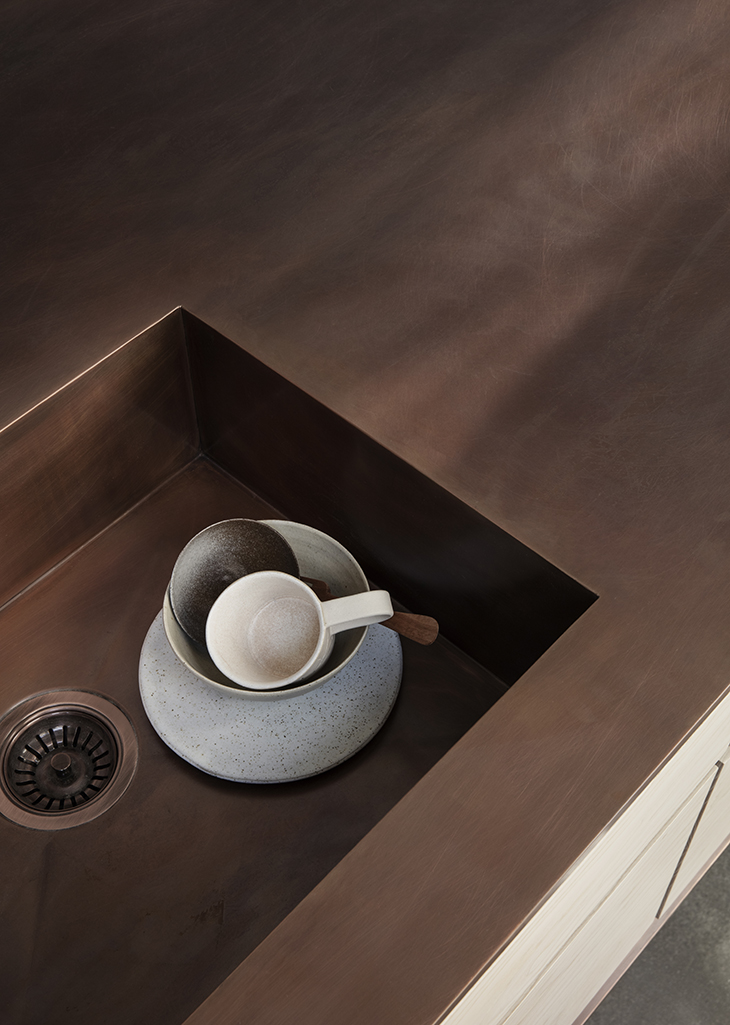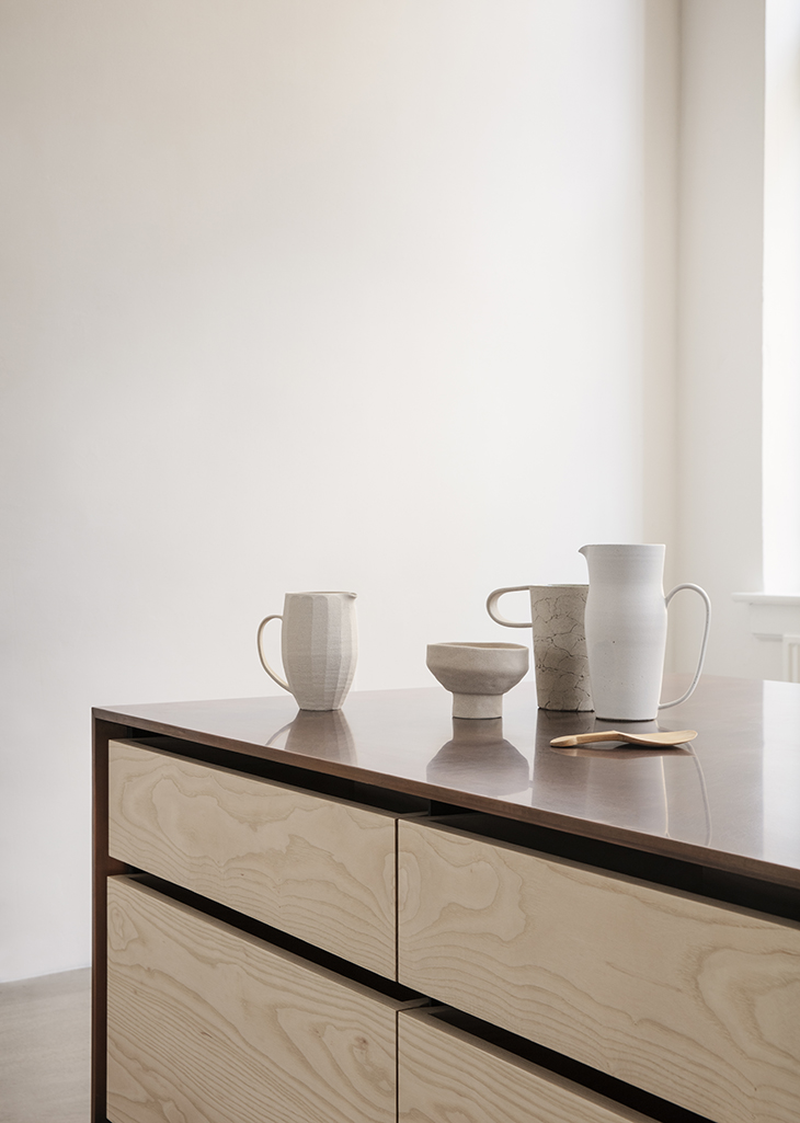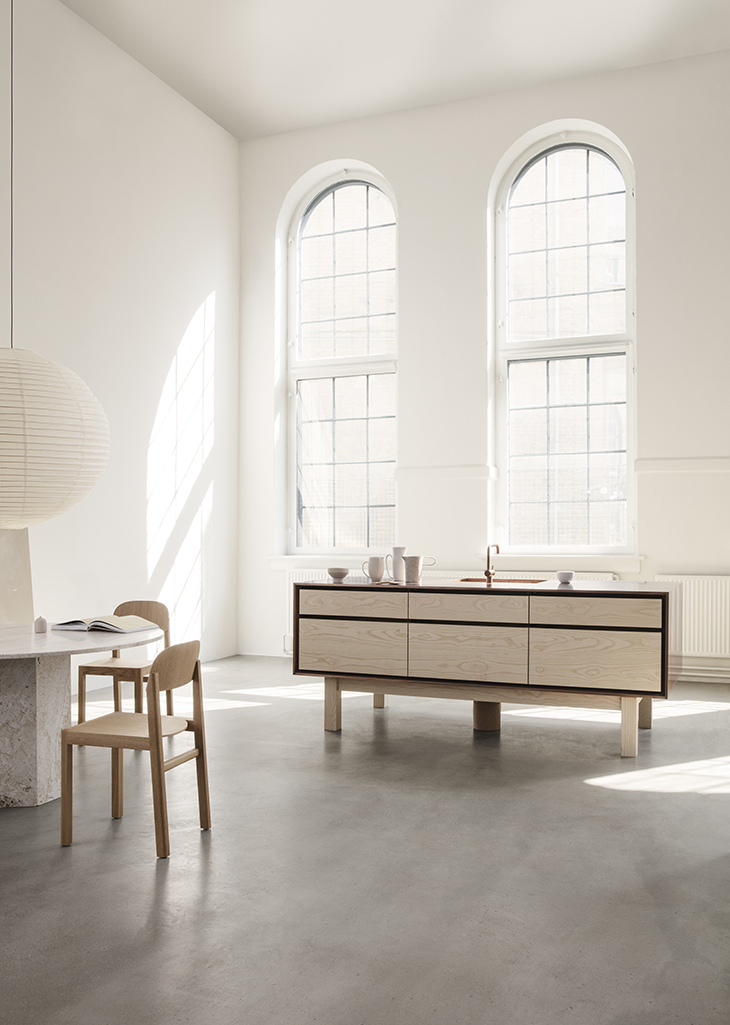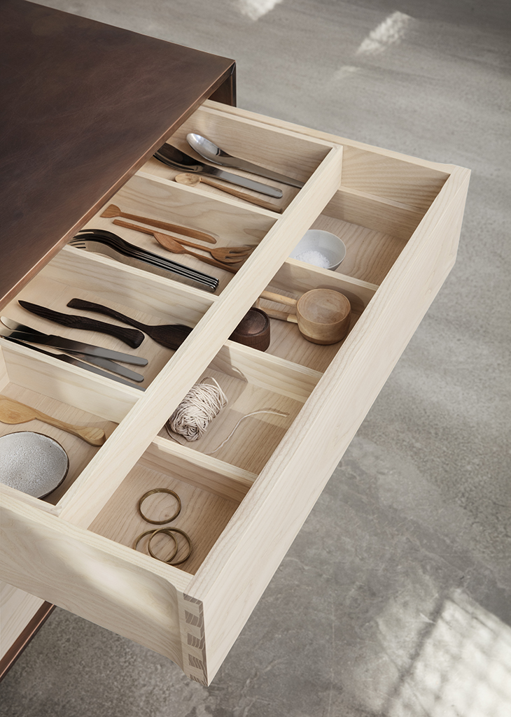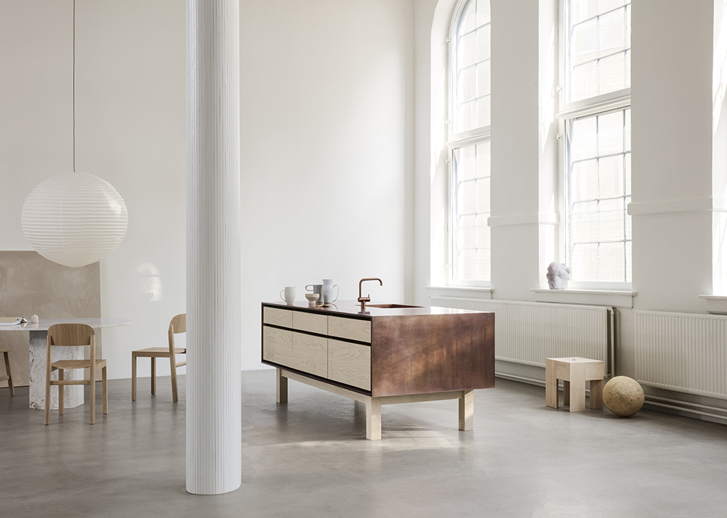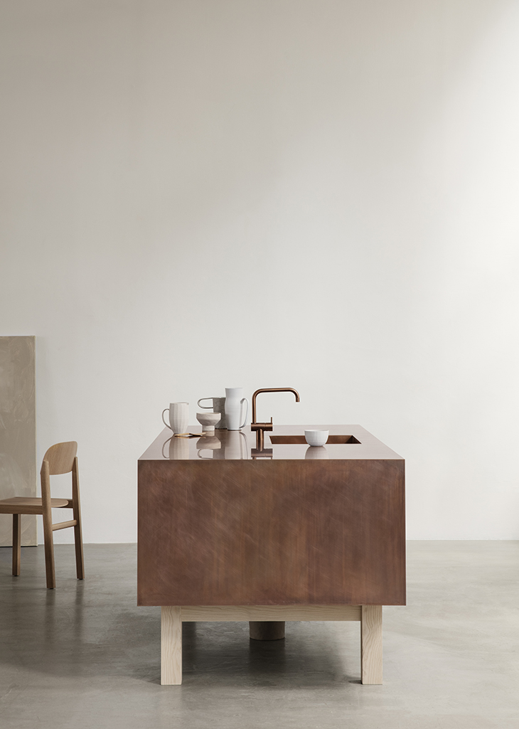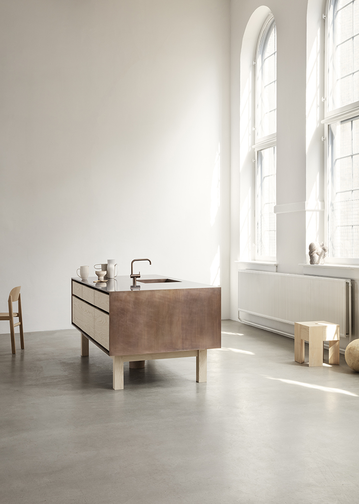 I det store lyse rum, der leder tankerne mod en katedral, træder model Framed frem i al sin glans: som et kunstværk i asketræ og kobber. Det smukke snedkerkøkken har et ekstraordinært udtryk i kraft af sit kabinet i patineret kobber, der indrammer skufferne i massivt asketræ, og rammen om møblet fungerer også som bordplade. Det er et køkken med karakter og reference til tidligere tiders køkkengrej i kobber, skabt til nutidig livsførelse og kunstfærdige kokkerier.