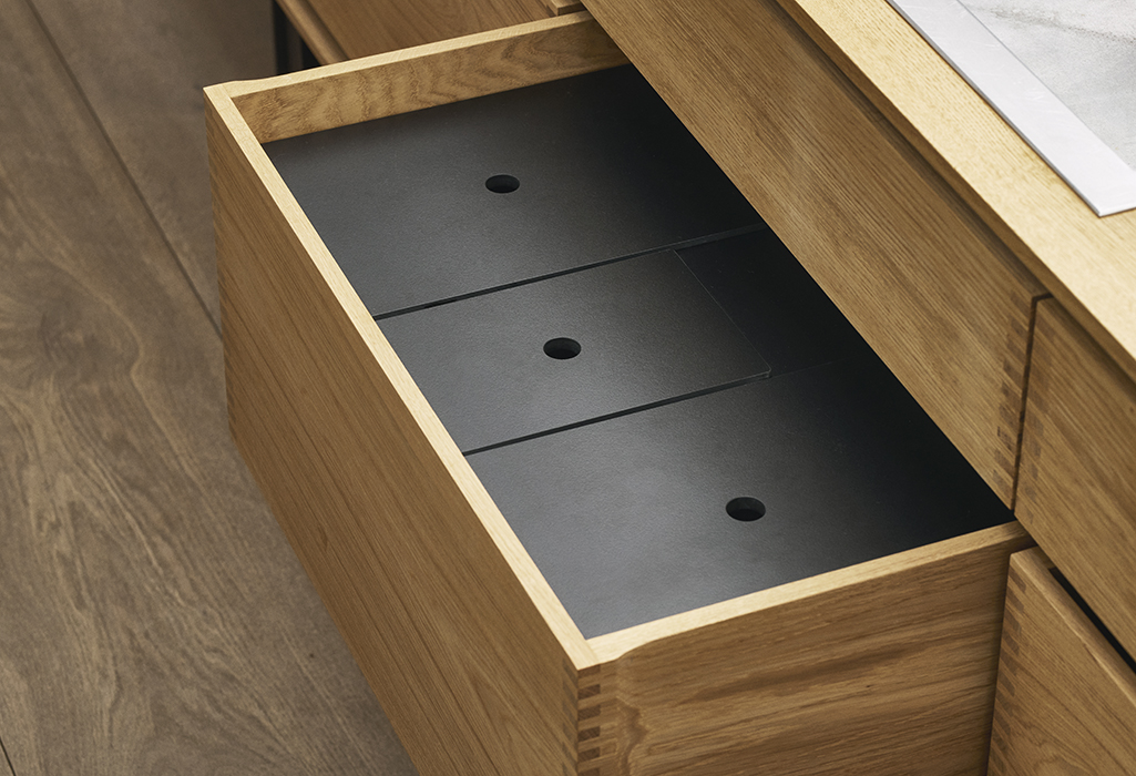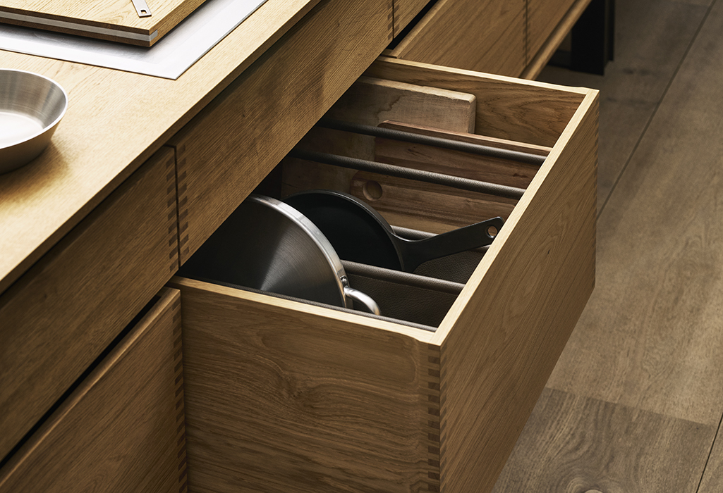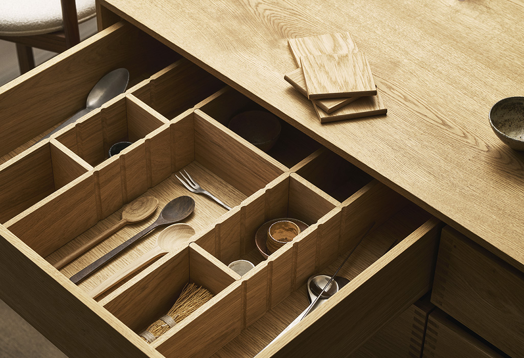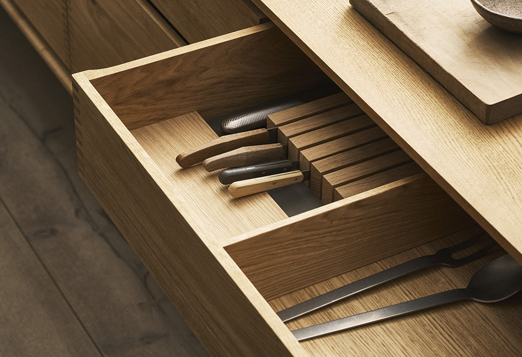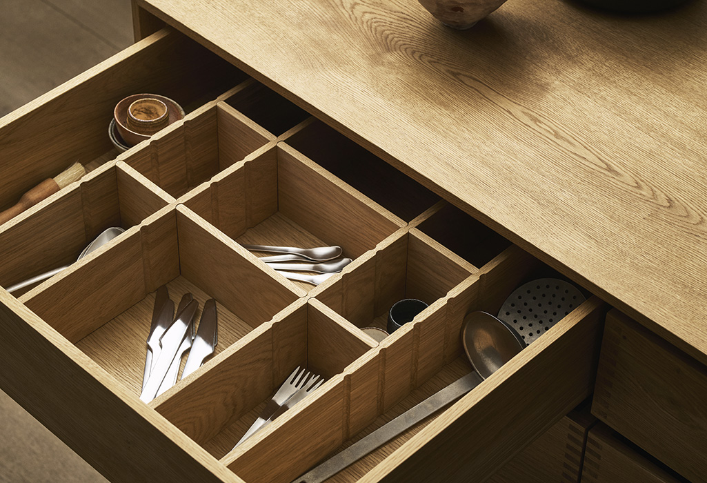 We offer a range of bespoke drawer interiors in solid wood – from cutlery trays and fixed dividers to flexible partitions and adjustable inserts. Each solution is designed as a natural extension of the furniture, crafted with the same materials, precision and attention to detail.